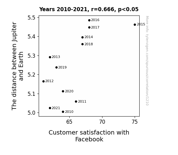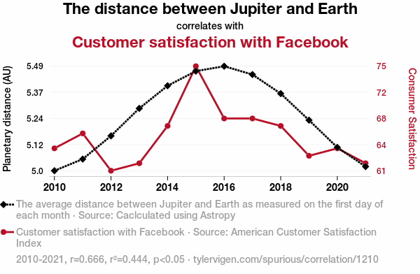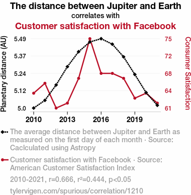 This means 44.4% of the change in the one variable (i.e., Customer satisfaction with Facebook) is predictable based on the change in the other (i.e., The distance between Jupiter and Earth) over the 12 years from 2010 through 2021.