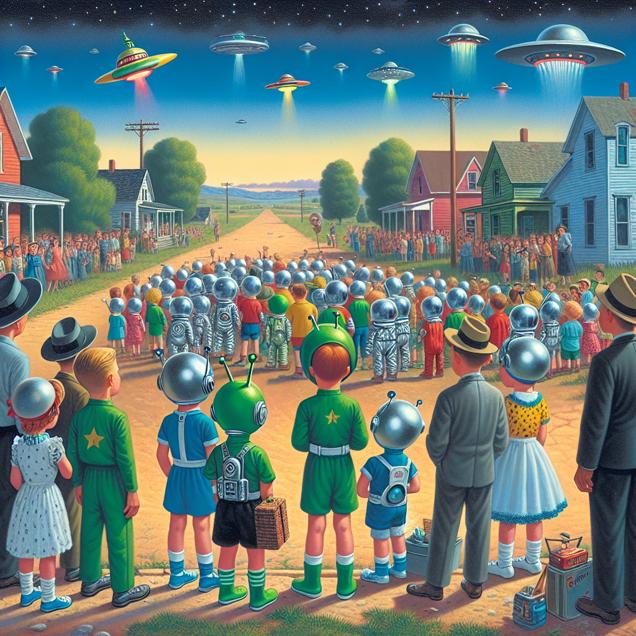 ChatGPT: In a small town in South Dakota, kids dressed in green alien costumes filled the neighborhood streets. Some had antenna headbands, and others had silver space suits. In the sky above, UFOs appeared, hovering and zipping around, as if drawn to the sudden surge of alien enthusiasts. Parents watched from their front porches, both amused and bewildered by the intergalactic scene unfolding before them.