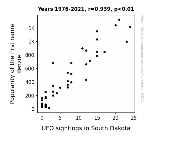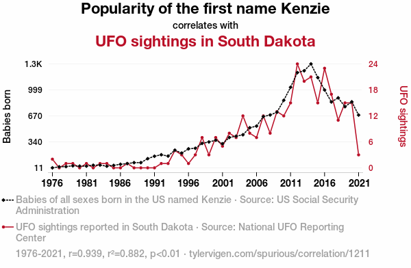 This means 88.2% of the change in the one variable (i.e., UFO sightings in South Dakota) is predictable based on the change in the other (i.e., Popularity of the first name Kenzie) over the 46 years from 1976 through 2021.