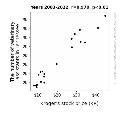 This means 94% of the change in the one variable (i.e., Kroger's stock price (KR)) is predictable based on the change in the other (i.e., The number of veterinary assistants in Tennessee) over the 20 years from 2003 through 2022.