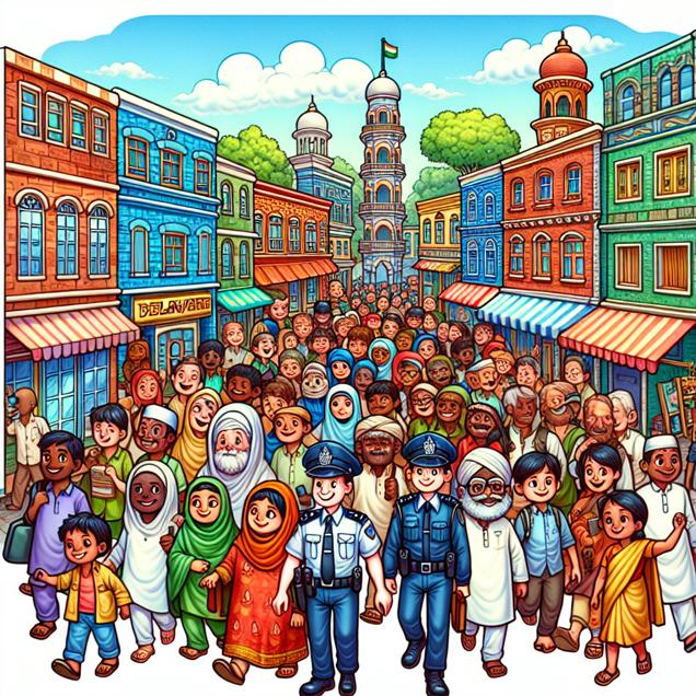 ChatGPT: [ Cute cartoon ] Create an image of a colorful bustling city street in Delaware, filled with quaint buildings and lively storefronts, with people of all sizes, shapes, and colors moving around and engaging in various activities. Along the street, cheerful police officers are strolling and keeping an eye on the bustling city. In the distance, visualize a group of mischievous-looking criminals happily turning in their illegal activities and choosing to participate in law-abiding behavior under the watchful eye of the vigilant officers. Next, shift the scene to a charming rural area in India, where adorable cartoon characters are seen using renewable energy sources like solar power for lighting and cooking. Showcase their happiness and content as they joyfully adopt this eco-friendly lifestyle, indicating a positive change from their previous dependency on kerosene due to the decrease in smuggling activities, all thanks to the impact of the law-abiding behavior adopted in the bustling city of Delaware. Ensure that the image captures the transition from a lively, bustling city to a peaceful, harmonious rural village, reflecting positive changes and law-abiding behavior in both settings.
