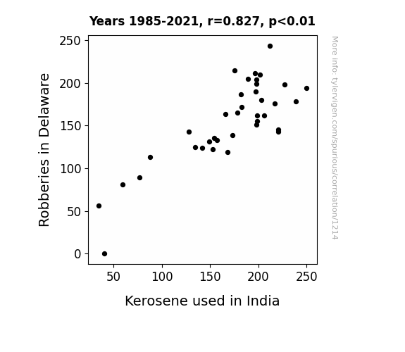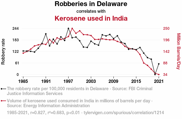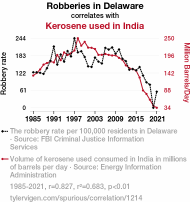 - The spurious research paper: Fuelling Crime: An Unexpected Link Between Robberies in Delaware and Kerosene Consumption in India