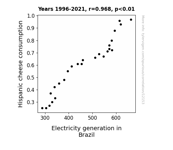 This means 93.6% of the change in the one variable (i.e., Electricity generation in Brazil) is predictable based on the change in the other (i.e., Hispanic cheese consumption) over the 26 years from 1996 through 2021.