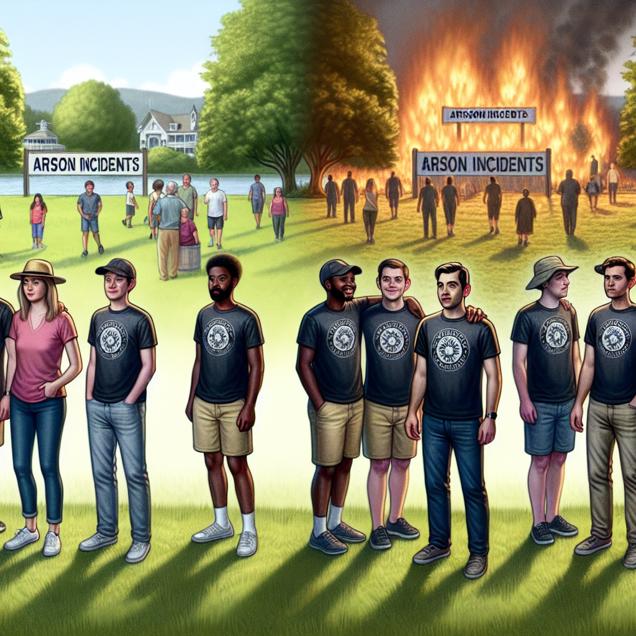 ChatGPT: [ Concept art ] Create an image of a serene park with a prominent sign that reads "Arson Incidents." In the background, there's a group of people wearing "Jarred" t-shirts. As the number of people wearing "Jarred" t-shirts decreases, the group becomes smaller, and the sign for "Arson Incidents" also starts to fade and becomes less visible, indicating a decrease in arson incidents. The scene suggests that as the number of people named Jarred decreases, the potential for arson also decreases, creating a calmer and safer park environment. Capture the transition from a larger group to a smaller group and the fading of the "Arson Incidents" sign to convey the correlation between the two elements.