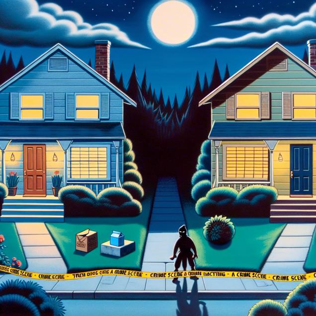ChatGPT: An image that looks like it is a scene from A Disney Movie and depicting this scene: A quiet suburban neighborhood at night. On one side of the street, a house with a neatly arranged front yard has no milk delivery at the doorstep. On the opposite side, a similarly tidy house does have a carton of milk on the doorstep. Suddenly, shadows emerge and a figure wearing a ski mask approaches the house without the milk, but then hesitates and decides to move on. The scene then shifts to a graphically rendered crime scene tape with a playful sign saying "Got Milk? Scene of the non-crime."
