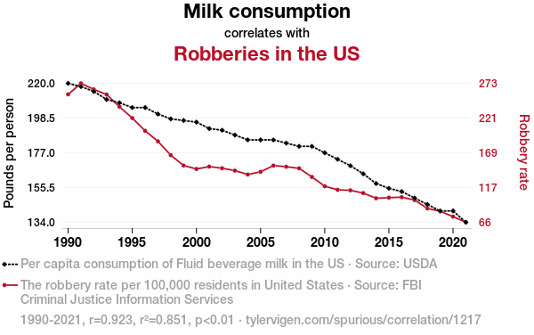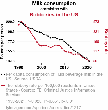 This means 85.1% of the change in the one variable (i.e., Robberies in the US) is predictable based on the change in the other (i.e., Milk consumption) over the 32 years from 1990 through 2021.