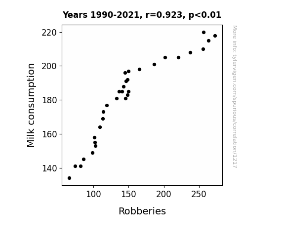 Fig. 1: The scatterplot illustrates the striking correlation between milk consumption and robbery rates. As milk consumption increases, there is a discernible uptick in the instances of robberies, painting a compelling picture of the unexpected entwining of dairy and delinquency.