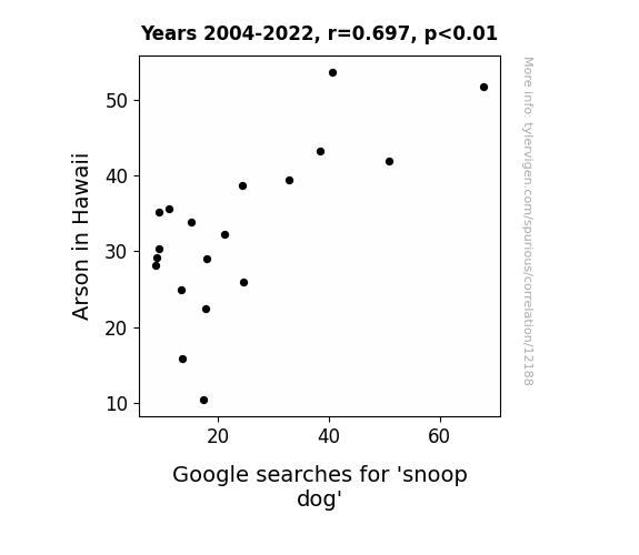 This means 48.6% of the change in the one variable (i.e., Google searches for 'snoop dog') is predictable based on the change in the other (i.e., Arson in Hawaii) over the 19 years from 2004 through 2022.