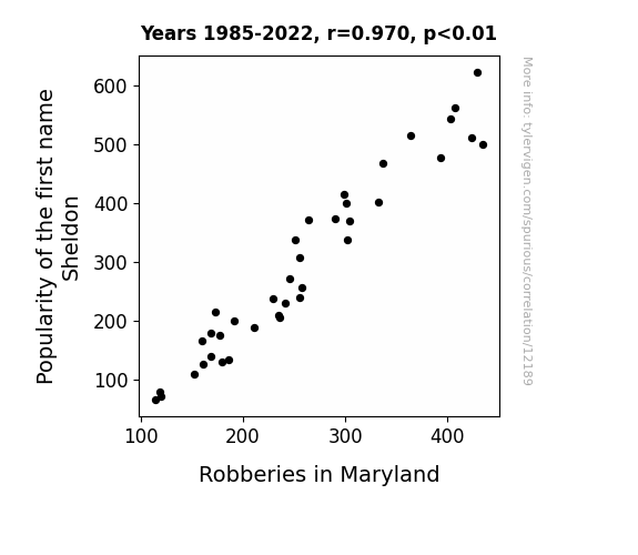 This means 94.1% of the change in the one variable (i.e., Robberies in Maryland) is predictable based on the change in the other (i.e., Popularity of the first name Sheldon) over the 38 years from 1985 through 2022.