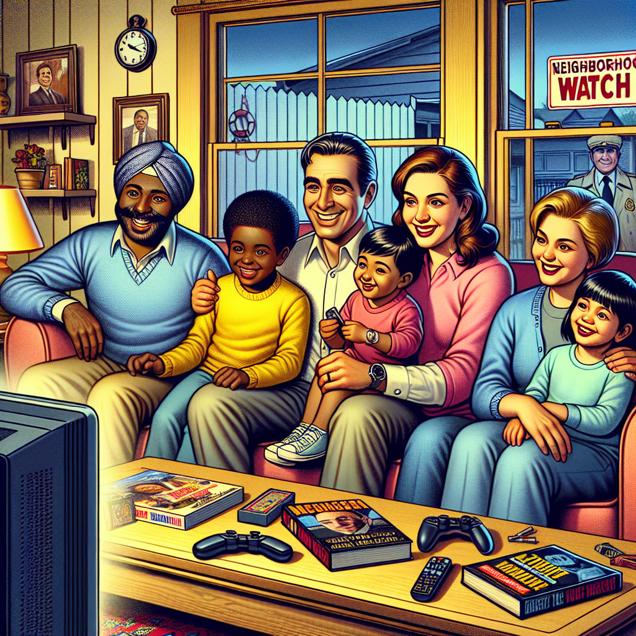 ChatGPT: In a cozy living room, a family sits around the television, engrossed in an episode of "Days of Our Lives." On the coffee table, there are scattered detective novels and crime-solving board games. Outside, a neighborhood watch sign is visible, indicating a decrease in burglaries. As a result, the family seems less animated, and the children are less engaged in the show, as their imaginations have been sparked by the thrill of solving fictional mysteries alongside the characters.