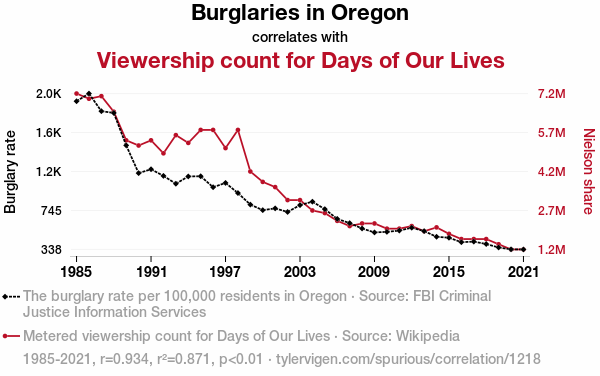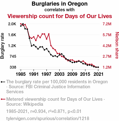 - The spurious research paper: The Days of Our Burglaries: An Examination of the Correlation Between Burglaries in Oregon and Viewership Count for Days of Our Lives