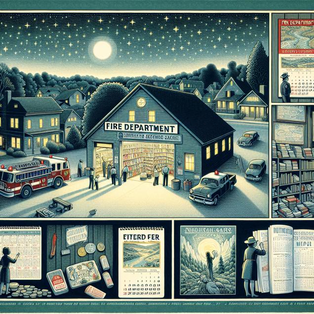 ChatGPT: Visual Prompt: Generate an image that reflects a serene scene of a small town in Arkansas. A woodblock painting illustrating a quaint town setting, where the frequency of arson incidents has declined. Include the fire department's station, with a calendar featuring xkcd comics about romance on the wall. Show fewer townspeople flipping through it. Place the firefighter's old box of fire starters gathering dust in a corner, symbolizing the decreased use due to fewer emergencies. Additionally, depict the town's bookstore with a stack of untouched xkcd comics about romance, highlighting declining sales. Capture the aroma of calm and safety in the air, and portray the peaceful twinkling of stars in the dark night sky outside.