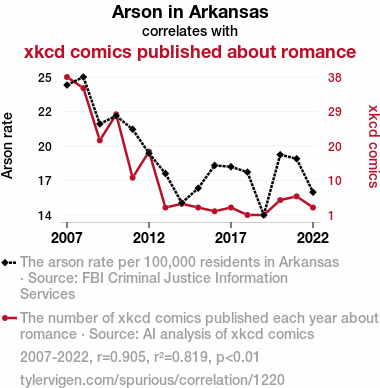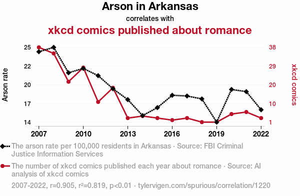 A linear line chart with years as the X-axis and two variables on the Y-axis. The first variable is Arson in Arkansas and the second variable is xkcd comics published about romance.  The chart goes from 2007 to 2022, and the two variables track closely in value over that time. Small Image