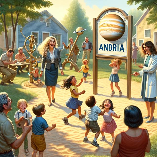 ChatGPT: Imagine a small town with a playground where children used to play. On one side of the playground, there is a sign with the name "Andrea" written on it, and many kids are playing around it. On the other side, there is a model of the planet Neptune, with a scientist observing it and pointing at the sign. Some parents are looking at the sign and discussing whether the proximity of Neptune influenced the popularity of the name "Andrea."