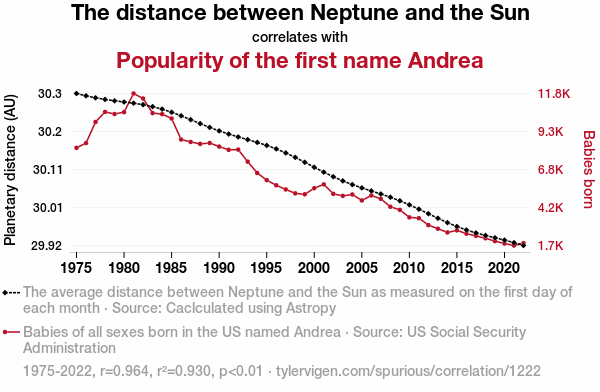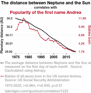 This means 93% of the change in the one variable (i.e., Popularity of the first name Andrea) is predictable based on the change in the other (i.e., The distance between Neptune and the Sun) over the 48 years from 1975 through 2022.
