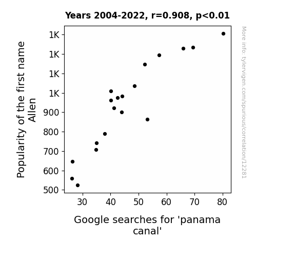 This means 82.4% of the change in the one variable (i.e., Google searches for 'panama canal') is predictable based on the change in the other (i.e., Popularity of the first name Allen) over the 19 years from 2004 through 2022.