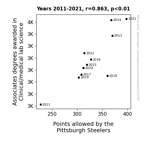 This means 74.5% of the change in the one variable (i.e., Points allowed by the Pittsburgh Steelers) is predictable based on the change in the other (i.e., Associates degrees awarded in Clinical/medical lab science) over the 11 years from 2011 through 2021.