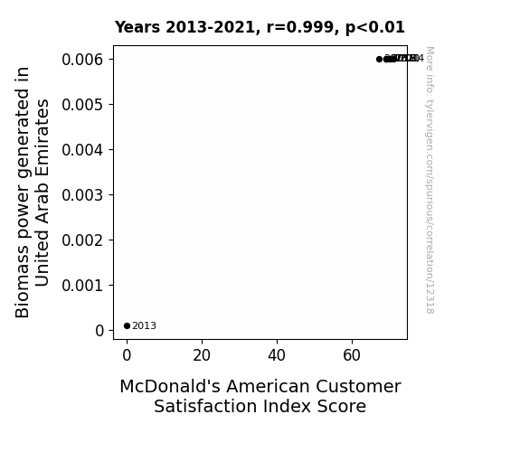 This means 99.8% of the change in the one variable (i.e., McDonald's American Customer Satisfaction Index Score) is predictable based on the change in the other (i.e., Biomass power generated in United Arab Emirates) over the 9 years from 2013 through 2021.