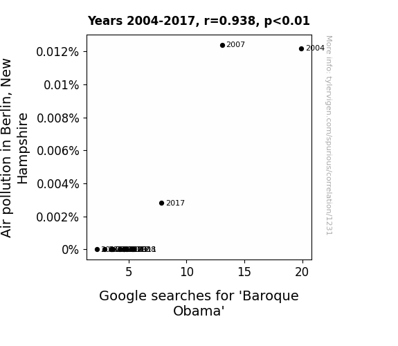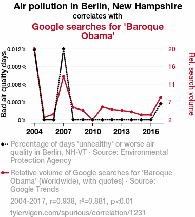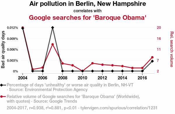A linear line chart with years as the X-axis and two variables on the Y-axis. The first variable is Air pollution in Berlin, New Hampshire and the second variable is Google searches for 'Baroque Obama'.  The chart goes from 2004 to 2017, and the two variables track closely in value over that time. Small Image