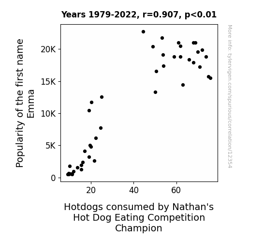 This means 82.3% of the change in the one variable (i.e., Hotdogs consumed by Nathan's Hot Dog Eating Competition Champion) is predictable based on the change in the other (i.e., Popularity of the first name Emma) over the 44 years from 1979 through 2022.