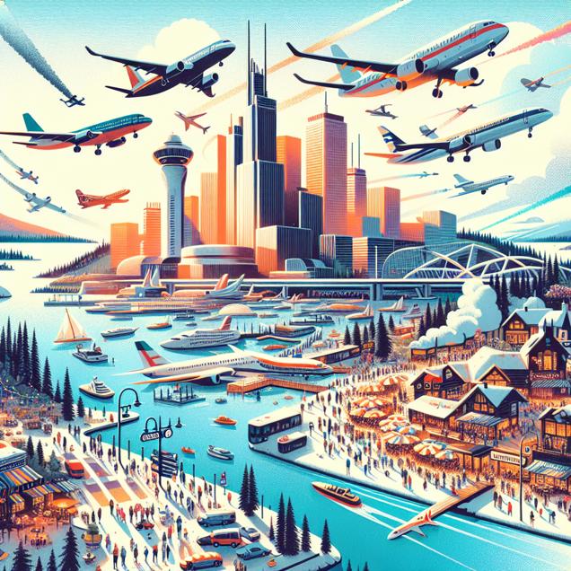 Prompt: [An image that looks like it is a scene from 'Star Wars'] Below the towering skyline of a bustling North American city, a sprawling airport teems with activity. Planes of various shapes and sizes land and take off continuously, leaving trails of jet exhaust in their wake. The air is alive with the vibrant colors of the aircraft as passengers eagerly embark on their journeys, bound for distant destinations. Meanwhile, in the picturesque landscapes of Finland, popular filming locations come to life as tourists flock to the iconic spots. Movie-themed tours buzz with excitement, and cafes and shops bustle with activity as enthusiasts immerse themselves in the magic of their favorite films. The enchanting beauty of the Finnish scenery serves as a backdrop to the fervor of movie fans seeking to experience their beloved stories firsthand. This visual encapsulates the dynamic interaction between the two regions, hinting at the flow of movie enthusiasts from North America to Finland, depicting the ensuing increase in air travel amid the enchanting allure of cinematic exploration. The depiction should include only scenes, people, and objects, it should not include text or speech bubbles.