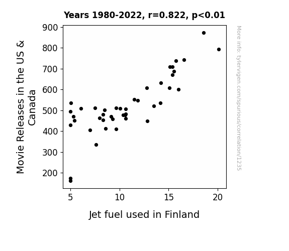 This means 67.6% of the change in the one variable (i.e., Jet fuel used in Finland) is predictable based on the change in the other (i.e., Movie Releases in the US & Canada) over the 43 years from 1980 through 2022.