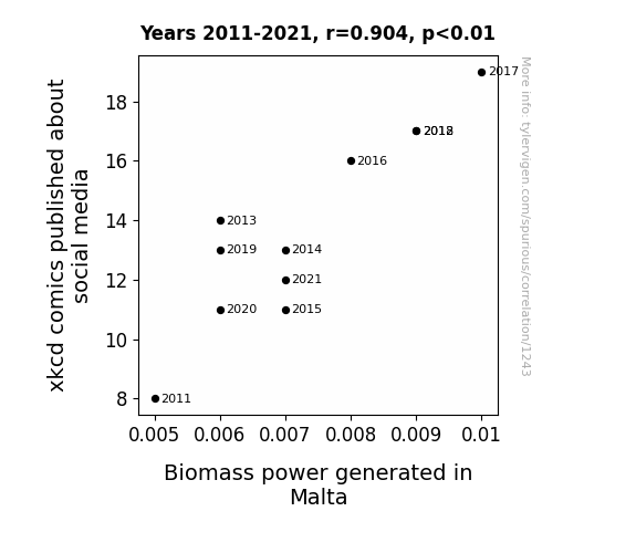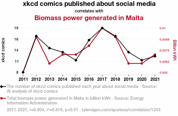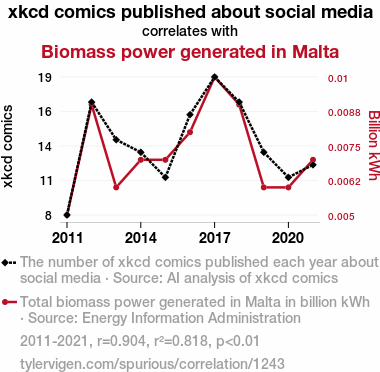 User prompt: Please make up a funny explanation for how an increase in xkcd comics published about social media caused Biomass power generated in Malta to increase. Make it feel plausible.