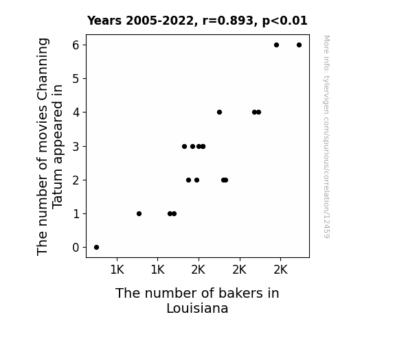 This means 79.8% of the change in the one variable (i.e., The number of bakers in Louisiana) is predictable based on the change in the other (i.e., The number of movies Channing Tatum appeared in) over the 18 years from 2005 through 2022.