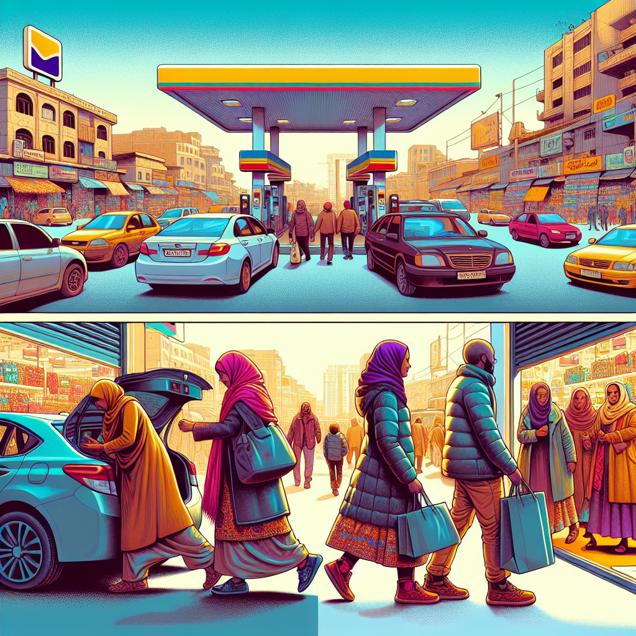 Prompt: "Generate a whimsical illustration of a lively Eritrean gas station, with colorful cars filling up their tanks. As the scene transitions, depict a bustling city street with pedestrians bustling in and out of shops. Among them, illustrate a couple exiting a car and stumbling upon a 'Macy's' sign. Inside the store, portray them joyfully discovering an amazing deal on a winter coat. Finally, depict the couple leaving Macy's with satisfied smiles, happy with their unexpected find. Keep the illustration simple, avoiding any words or speech bubbles." The depiction should include only scenes, people, and objects, it should not include text or speech bubbles.