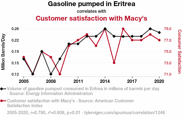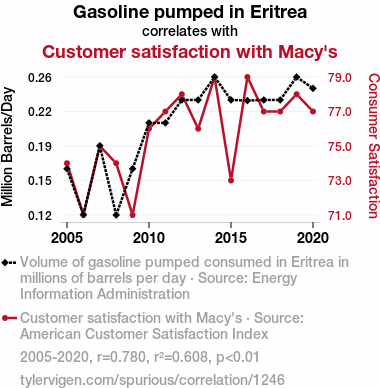 - The spurious research paper: Fueling Satisfaction: Examining the Unlikely Relationship Between Gasoline Pumped in Eritrea and Customer Contentment at Macy's