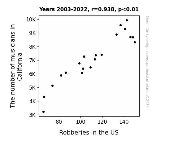 This means 88% of the change in the one variable (i.e., Robberies in the US) is predictable based on the change in the other (i.e., The number of musicians in California) over the 20 years from 2003 through 2022.