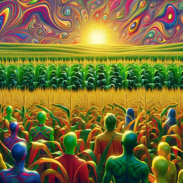 Prompt: Generate an image of a pop art style depiction of a vast cornfield. In the background, show a group of extraterrestrial beings with bright, vivid colors gazing in wonder at the picturesque landscape. The sun casts a golden glow over the field, enhancing the vibrancy of the green stalks. The extraterrestrial beings' eyes should gleam with curiosity and amazement. The scene should convey an otherworldly sense of wonder, with a playful and vibrant pop art style. The depiction should include only scenes, people, and objects, it should not include text or speech bubbles.