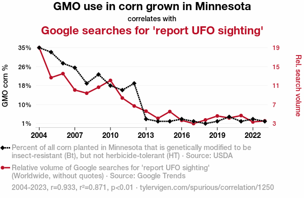 GMO, UFO, genetically modified organisms, corn cultivation, Minnesota, Google searches, correlation coefficient, statistical significance, p-value, USDA data, Google Trends, agricultural practices, extraterrestrial interest, public curiosity, unconventional variables, agricultural research