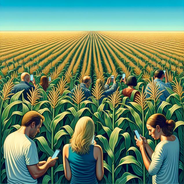 ChatGPT: Imagine a cornfield stretching across the Indiana countryside under a clear sky. The corn stalks are tall and green, swaying gently in the breeze. Suddenly, some of the stalks start shaking and bending oddly, as if in a state of confusion. Nearby, people are seen staring at their phones, their expressions turning incredulous as they scroll through a barrage of strange search results.