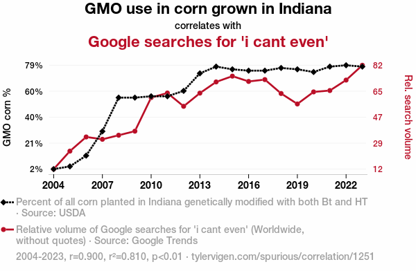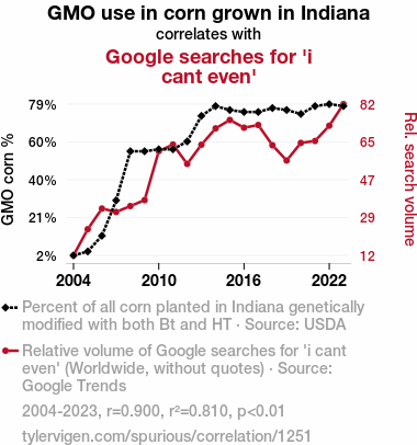This means 81% of the change in the one variable (i.e., Google searches for 'i cant even') is predictable based on the change in the other (i.e., GMO use in corn grown in Indiana) over the 20 years from 2004 through 2023.