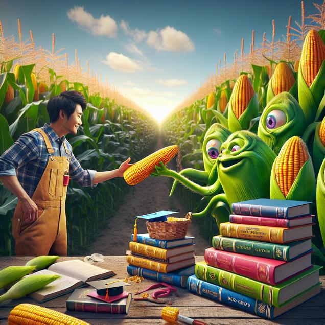 ChatGPT: In a sunny cornfield in Ohio, a farmer in overalls holds a basket of vibrant, non-GMO corn. Nearby, a stack of colorful education master's degree certificates sits on a wooden table. As the farmer reaches for a corn cob, the corn seems to shy away, forming a playful smile that suggests a preference for being cared for by individuals with higher education qualifications.