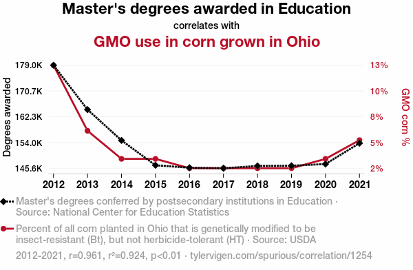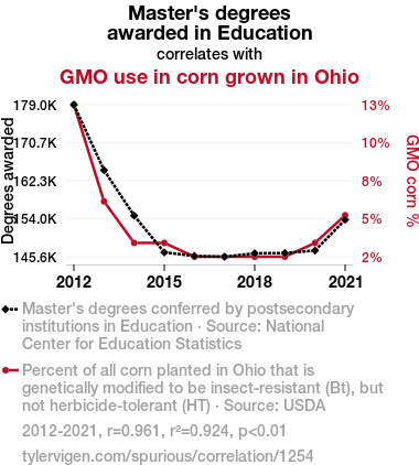 - The spurious research paper: Kernel of Truth: Exploring the Cob-nnection Between Education Master's Degrees and GMO Corn Use in Ohio