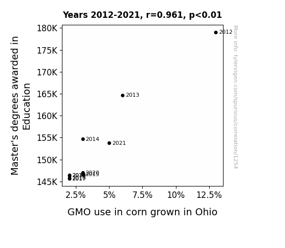 The correlation between the number of Master's degrees awarded in Education and the use of genetically modified organisms (GMOs) in corn cultivation in Ohio during the period from 2012 to 2021 was found to be 0.9613789. This strong positive correlation suggests a tantalizing "corn-nection" between these two seemingly distinct fields. It looks like our research has truly "stalked" a compelling relationship here!