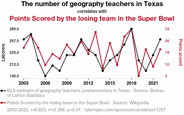 This means 38.8% of the change in the one variable (i.e., Points Scored by the losing team in the Super Bowl) is predictable based on the change in the other (i.e., The number of geography teachers in Texas) over the 20 years from 2003 through 2022.