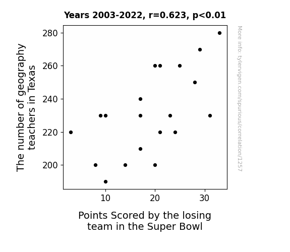 The correlation coefficient of 0.6226698 indicates a strong positive relationship between the number of geography teachers in Texas and the points scored by the losing team in the Super Bowl. This result suggests that as the count of geography teachers in the Lone Star State rises, so too does the score of the unfortunate losing team. It's almost like a geographic version of the butterfly effect – a teacher flapping a map in Texas might just cause a touchdown in the Super Bowl. Talk about putting the "geo" in "geographical influence"!