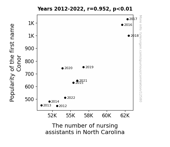 This means 90.6% of the change in the one variable (i.e., The number of nursing assistants in North Carolina) is predictable based on the change in the other (i.e., Popularity of the first name Conor) over the 11 years from 2012 through 2022.