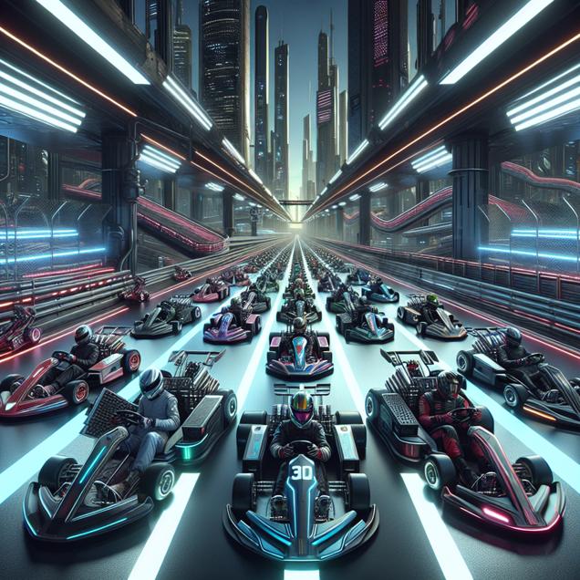 Prompt: Prompt: Generate an image of a futuristic go-kart race track with a lineup of sleek, high-tech go-karts, each uniquely designed to pay homage to the iconic racing driver Fernando Alonso. The track is illuminated by neon lights and surrounded by towering buildings, giving a glimpse of a futuristic cityscape in the backdrop. Each "Alonzo" driver is depicted with intense focus as they maneuver through the challenging twists and turns, showcasing their competitive spirit and determination to emerge as the ultimate World Drivers' Champion. The depiction should include only scenes, people, and objects, it should not include text or speech bubbles.