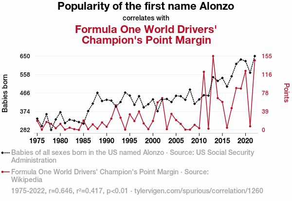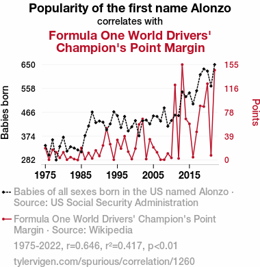 - The spurious research paper: Alonzo's Drive to Victory: The Correlation Between the Popularity of the Name Alonzo and Formula One World Drivers' Champion's Point Margin