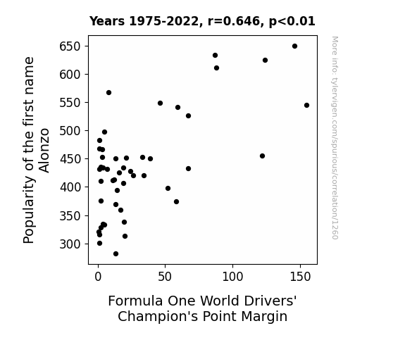 This means 41.7% of the change in the one variable (i.e., Formula One World Drivers' Champion's Point Margin) is predictable based on the change in the other (i.e., Popularity of the first name Alonzo) over the 48 years from 1975 through 2022.