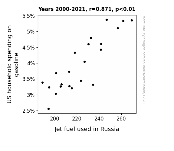 This means 75.9% of the change in the one variable (i.e., Jet fuel used in Russia) is predictable based on the change in the other (i.e., US household spending on gasoline) over the 22 years from 2000 through 2021.