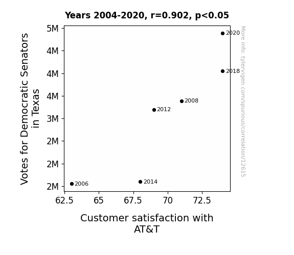 This means 81.3% of the change in the one variable (i.e., Customer satisfaction with AT&T) is predictable based on the change in the other (i.e., Votes for Democratic Senators in Texas) over the 6 years from 2004 through 2020.