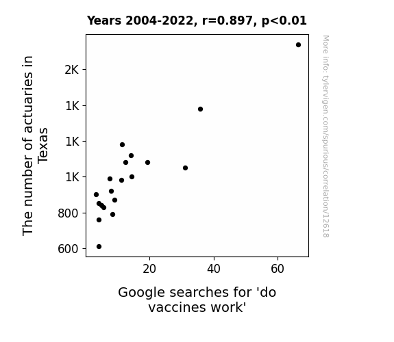 This means 80.5% of the change in the one variable (i.e., Google searches for 'do vaccines work') is predictable based on the change in the other (i.e., The number of actuaries in Texas) over the 19 years from 2004 through 2022.