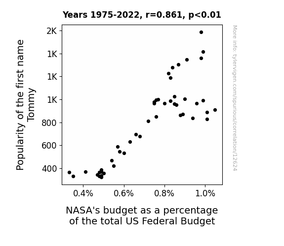 This means 74.2% of the change in the one variable (i.e., NASA's budget as a percentage of the total US Federal Budget) is predictable based on the change in the other (i.e., Popularity of the first name Tommy) over the 48 years from 1975 through 2022.