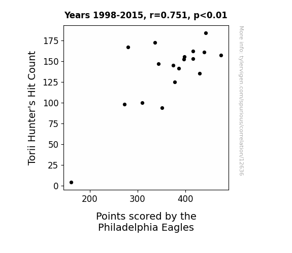 This means 56.4% of the change in the one variable (i.e., Points scored by the Philadelphia Eagles) is predictable based on the change in the other (i.e., Torii Hunter's Hit Count) over the 18 years from 1998 through 2015.