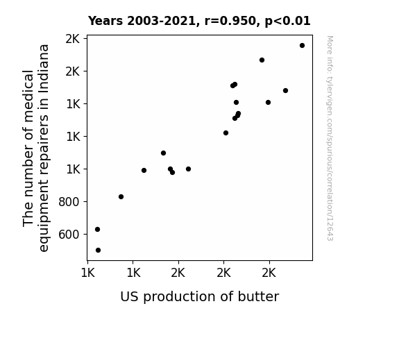 This means 90.3% of the change in the one variable (i.e., US production of butter) is predictable based on the change in the other (i.e., The number of medical equipment repairers in Indiana) over the 19 years from 2003 through 2021.
